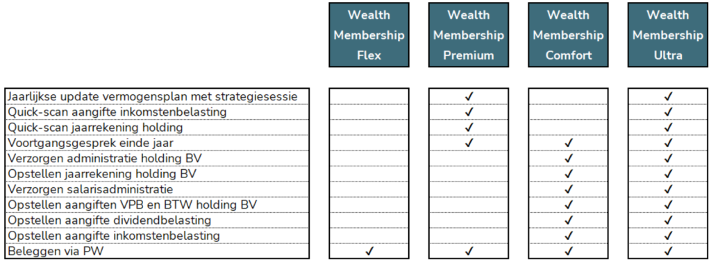 Je kunt zelf je abonnementsvorm kiezen. Kies je voor het Wealth Membership Flex? Dan betaal je alleen als je je vermogensplan laat updaten. Kies je voor het Wealth Membership Premium? Dan doen we een quick-scan op je jaarrekening én op je aangifte inkomstenbelasting. Met de quick scan zoeken we naar fiscale kansen. Ook hebben we bij het Premium abonnement een jaarlijks gesprek aan het einde van het jaar.